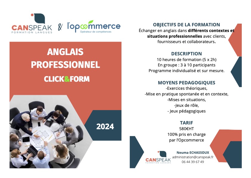 Depuis 2024, CANSPEAK a été sélectionné par l’Opcommerce pour des formations en groupe, en anglais et en espagnol professionnel. Ces formations sont entièrement financées par l’Opcommerce.